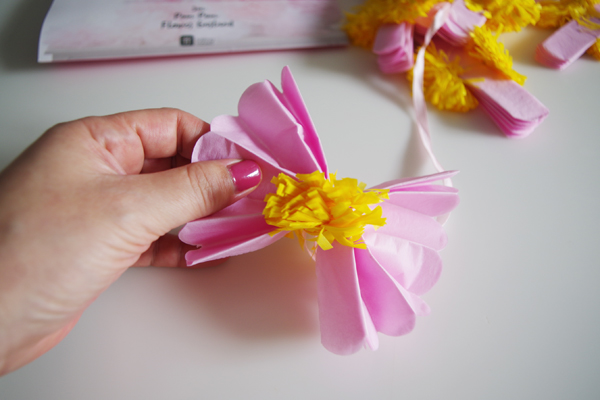 昨日、自宅のワインを持参するのに、昔から愛用しまくってる→ クシュ紙でくるっと巻いて、リボンをつけて簡易ラッピングしかけたとき、このフラワーポンポン付きガーランドが目について...