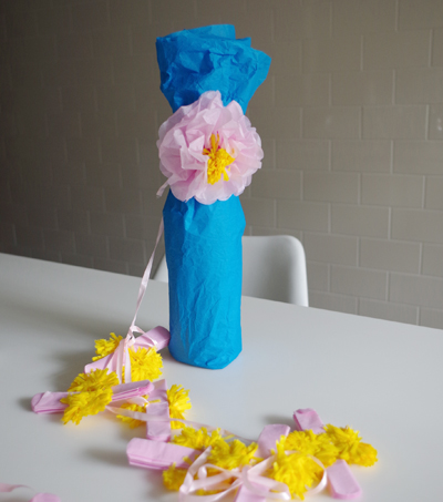 フラワーポンポンのガーランドを、ワインボトルのラッピングに使ってみました