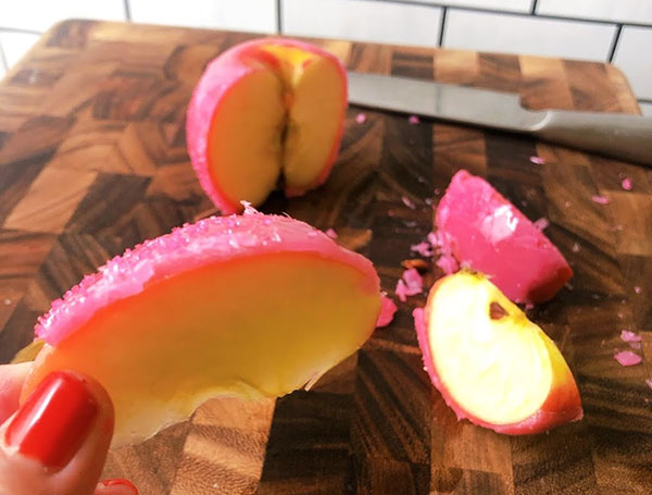 実は一番右の手に持った林檎だけ、サンディングシュガーのピンクをふりかけたんですが... これはダメ。ちょっとだけついたけど、ほぼ飴に弾いて飛び散りました...
