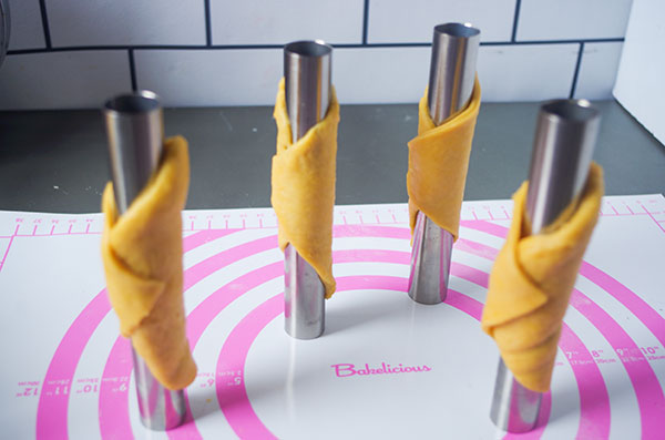 このレシピだとね。『カンノーリ型を直立して焼く』ってんでオーブンの余熱を逃さず、さらには棒を倒さないためにどうすんのさ?としばし悩んだりもしたけど...