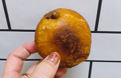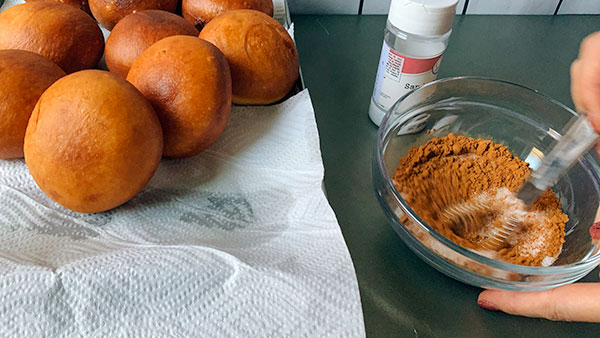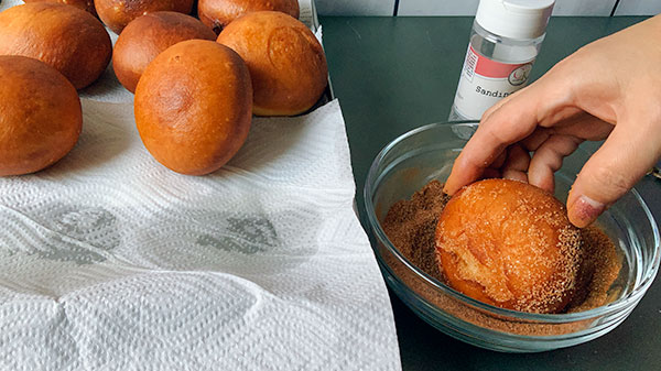 油で揚げたあと、サンディングシュガーとシナモンパウダーを同量まぜてまぶしたんだけど...