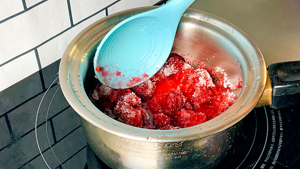 細いタイプと太いタイプ、2種類あって。細いタイプでジャムを入れるべく... 冷凍ラズベリーに半量の砂糖を煮てみることに。