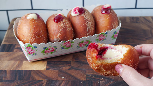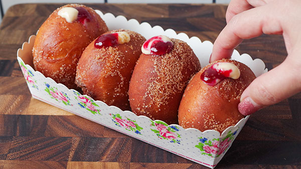 出来たドーナツはラッピング用のパウンドケーキ型セットに並べ、立てた状態でカスタードとラズベリーソースを注入♪