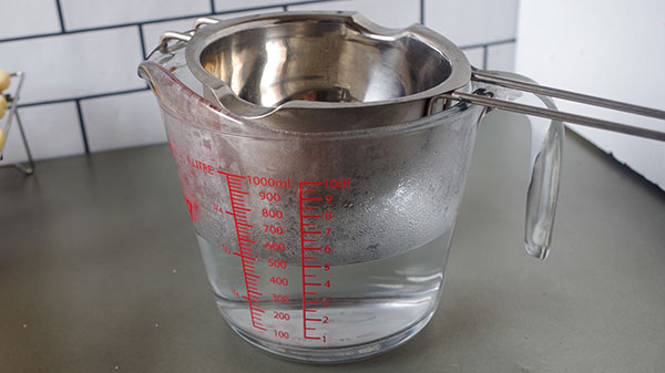 先日、新商品で紹介した小さい湯煎用ボウルでチョコを溶かす。Fire King(ファイヤーキング)の耐熱メジャーカップ 1Lサイズに乗せるとこんな感じで...