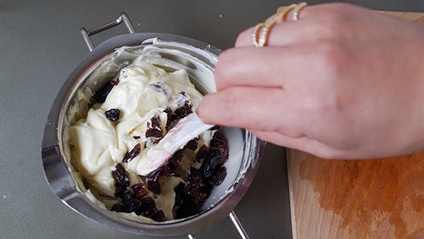 溶けたホワイトチョコにバタークリームをよく混ぜたあと、レーズンも少しづつ混ぜて.. あ、おおよその分量はこちらのレシピを参考にさせて頂きました。