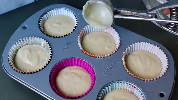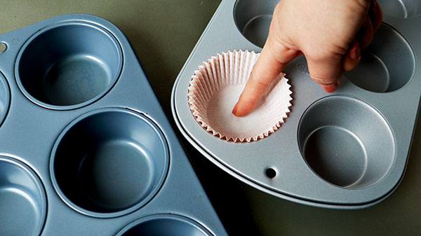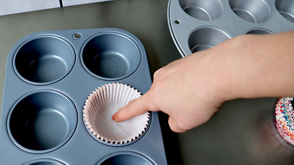 生地を入れ終えたら、マフィンパンを机に軽くトントンとやって、生地の空気を少し抜いてから焼けばOK!