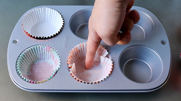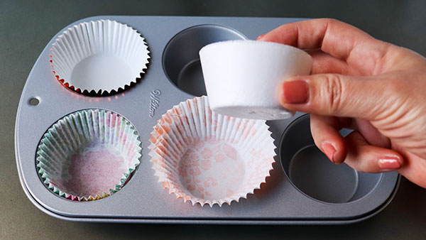 マフィンパンにカップを置いただけだと、プカッと浮き上がっているかもですが、生地を入れたら重みでマフィンパンにしっかりハマってくれます。