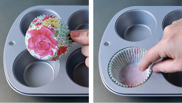 これを、マフィンパンにのせたベーキングカップにかぶせて凹みに入れ、側面を押し付けながらギャザーをアイロンしてみてください。