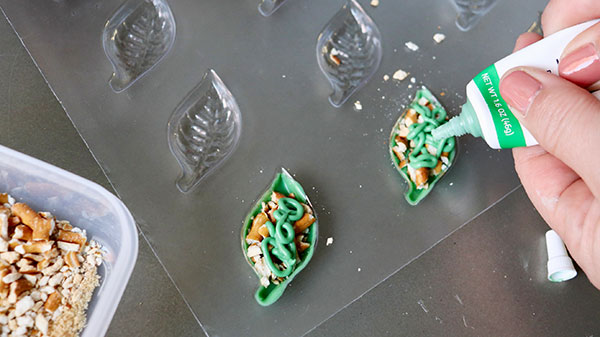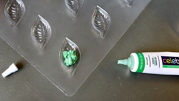 と思いつき、葉っぱのチョコ型 90-13-35 を準備。チョコを絞るだけでも良いのですが、少しだけ深さがある型なので、最初にキャンディライターのダークグリーンを、Wiltonの筆で塗り伸ばしました。