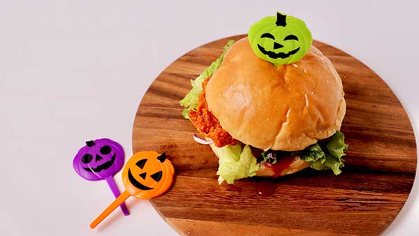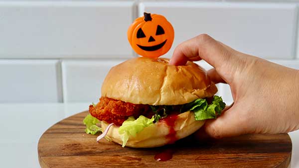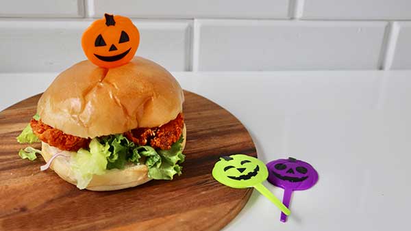 先日ランチを食べ損ねて、ローソンでエルチキ(赤くて辛めなヤツ)と、それを挟むためのフワッフワなバンズを買ったとき、「あ、そうだ!」とこのピックをさしてみたんだけど...