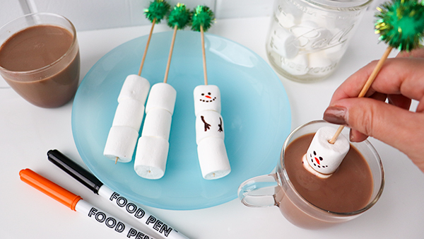 ピックに刺したマシュマロをテーブルへ出したら、みんなでお絵描きして、最後は熱々のココアにクルクル...
