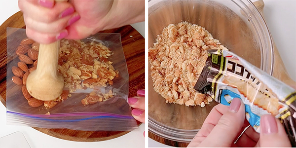 この型は少し大きめなので、チョコだけで固めちゃうと食べづらいので、アーモンドココナッツサブレを砕いてチョコに混ぜました(ビスケットや他ナッツ類でも良いですよ!)