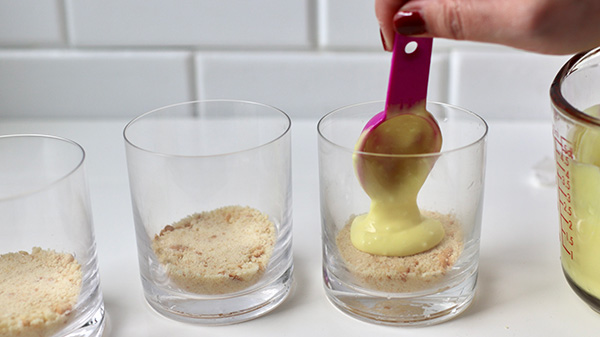 キレイに仕上げたいときは、タルト棒を使うとパーフェクト。狭いグラスの中でも、平らに整えられてこの道具メッチャ便利でお薦め。