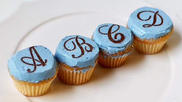 バタークリームならステンシルで文字や数字、模様をつけることができます。粉が多く残った状態でステンシルを外すと滲みやすいので、ここだけはご注意を(Cのカップケーキが多すぎてます)