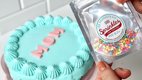 ケーキにのせ、ミニ・パステルコンフェッティで賑やかにしてフィニッシュ!