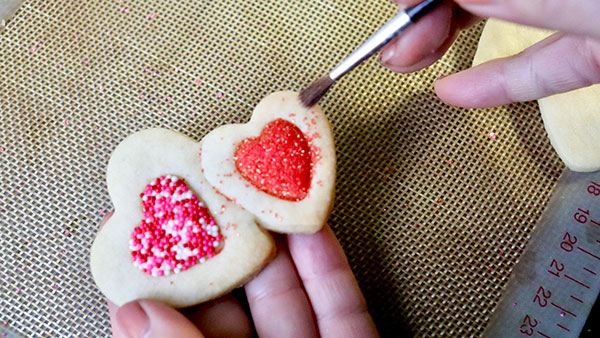 焼き上げたクッキーにつける場合、アイシングシュガーに水を混ぜて固めに仕上げたら筆で塗り、表面が乾かないうちにパラパラッとふりかけます。