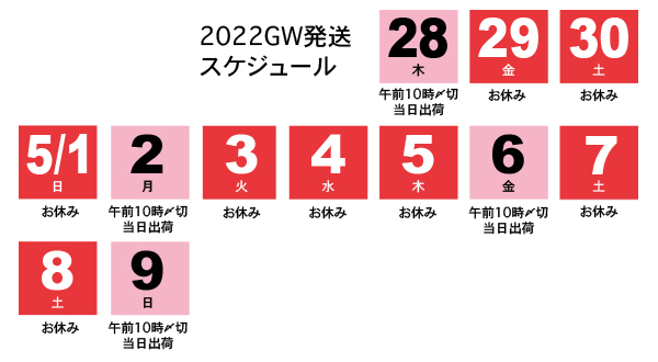 ゴールデンウィークですが、今年も暦通りの発送スケジュールです。