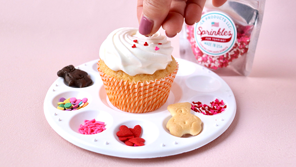 ちっちゃなハートや好きな色のスプリンクル、市販のビスケットなどをパレットにもりつけて、トッピングを楽しんでみるのは、どう?