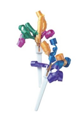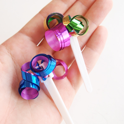 ピックにメタリックなブルーやゴールド、ピンク、グリーンのカールリボンがついている、パーティーに使えそうなピック!