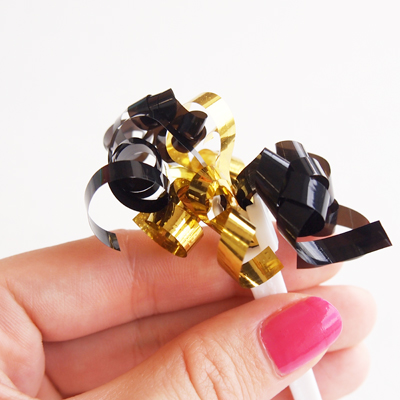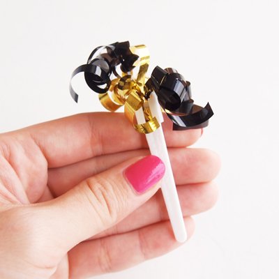 プラスチック製のピックの先端にゴールドとブラックのカールリボンが付いています。