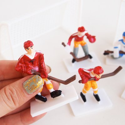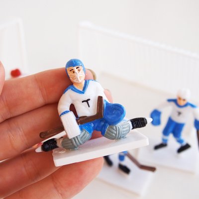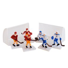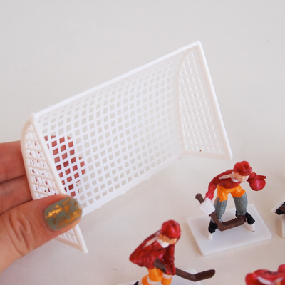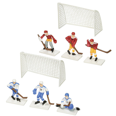 アイスホッケーのゴールと、6人の人形のケーキトップです。