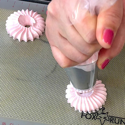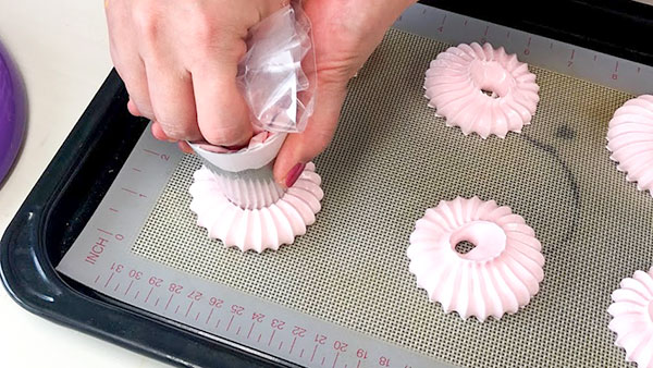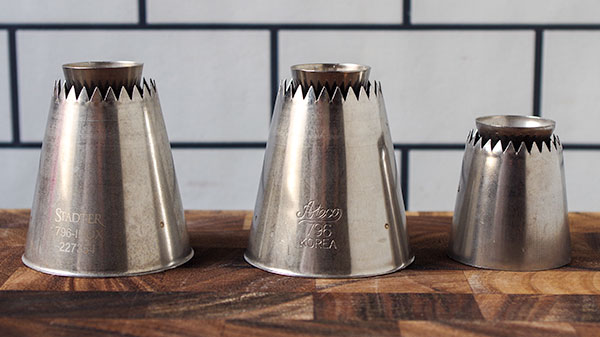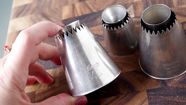 大きめな口金(ステンレス)でサルタン口金で、チカラを入れてぎゅっと絞るとこんな風なメレンゲを絞ることができます。