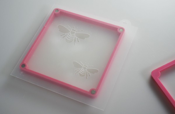 磁石のついた2つのフレームの間に、ステンシルを挟んで使う道具です。固定されることでステンシルが滑ったり、動いたりするのを防ぐことができます。