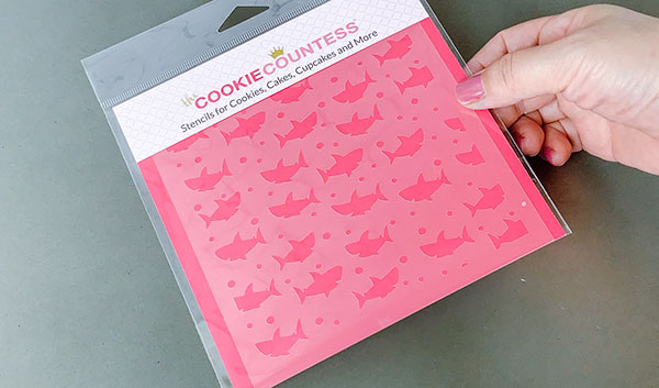 5.5インチ正方形のステンシルで、たくさんのサメが模様になっています。