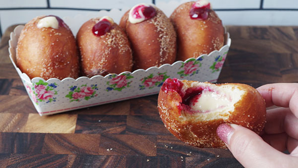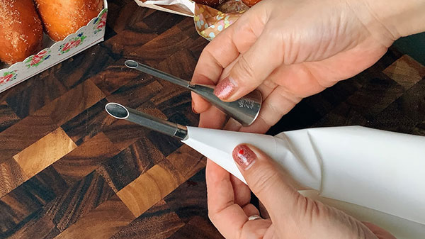 個人的には細いタイプは柔らかく、チカラを入れずに少し注入したいものに向いているような気がして、クリームドーナツのラズベリージャム(ソースのようなもの)を注入してみました。