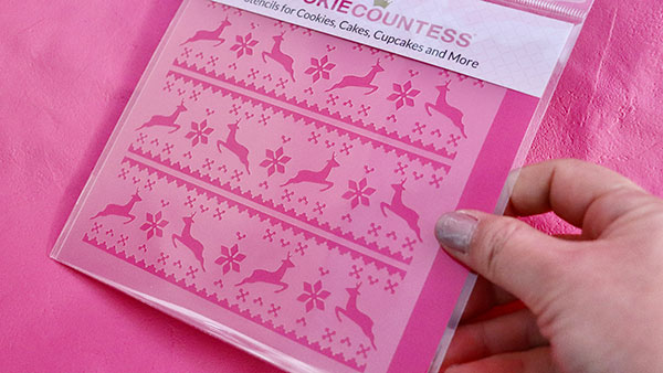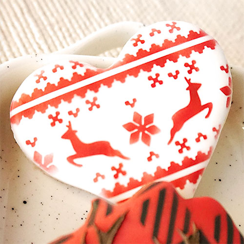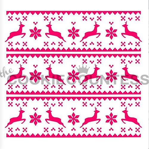 セーターのニット模様のようなステンシルで、鹿(トナカイ)や雪の結晶のようなモチーフがパターン化されています。