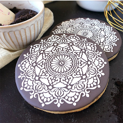 ステンシルの厚みが薄めなのでアイシングクッキーの柄付けや、小さめケーキのデコレーション等、自由な発想でご活用ください。