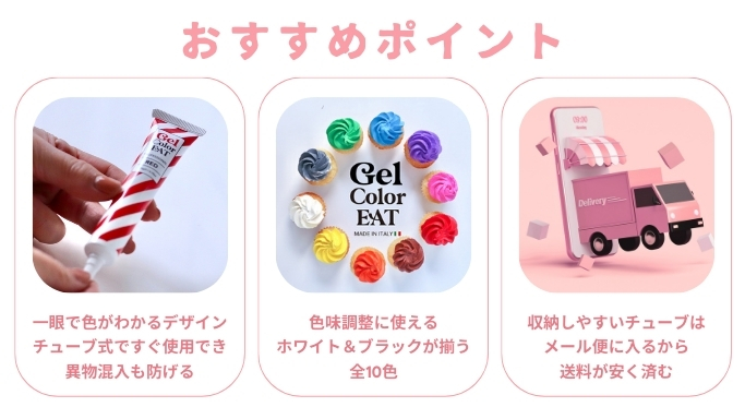 | その他 | ジェル着色料の賞味期限は未開封時のもので、メーカー推奨は開封後は3ヶ月程度です |