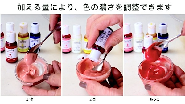シェフマスターのジェル状着色料はその手間がなく、小さなミニボトルから直接カラーを加えることが可能です。