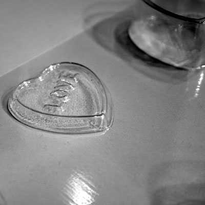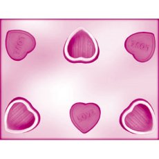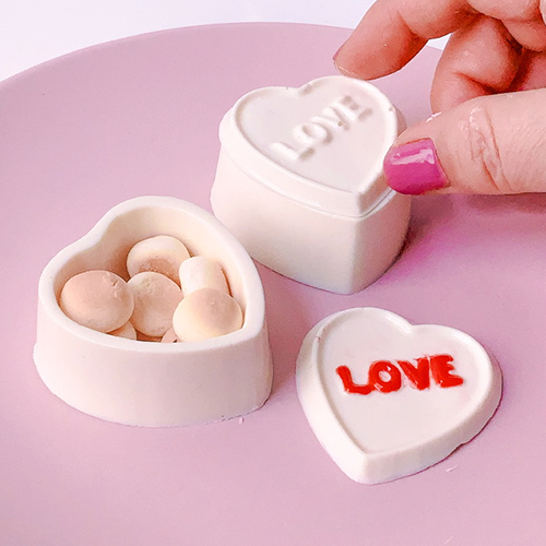 ハート箱が同時に3つできるチョコレート型、フタの部分にはLOVEの文字入り。