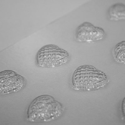 上から、資生堂のマークのような柄がついたハート、バラ柄のハート、キルティング柄のようなハ-トや、レース柄のようなハート、計4種類のハートがそれぞれ12個づつできるチョコレート型です。