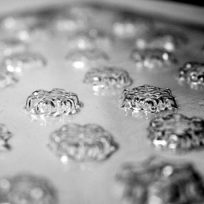 このチョコ型は粒が小さいので中央に少し絞ったチョコを、ケーキテスターや楊枝で型の細かな部分へ押し入れるほうがキレイにできます