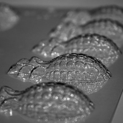 | 素材 | ポリエチレン(耐熱温度65度)下敷きのような素材なのでカタチによって真っ平らにはならず、机でカタカタいう場合がありますが、凹みに入れたチョコが流れ出ませんので良品となります。 |