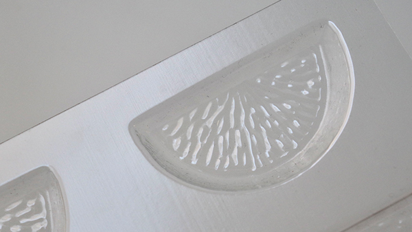 カットしたオレンジのチョコレート型。果肉や皮の柄もしっかりついていてリアルです。