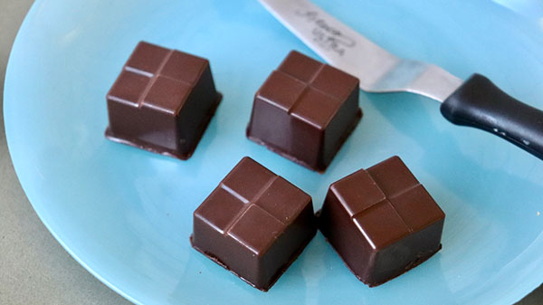 チョコ型の外側ができあがったら、内側にガナッシュなどを詰めます。