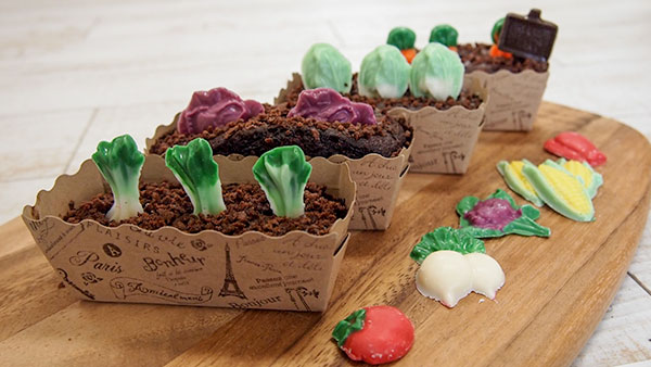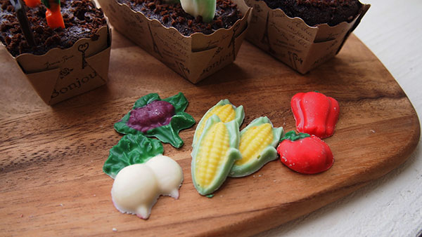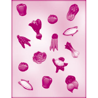 ピーマン、トマト、トウモロコシが各2個づつ、白菜、カブ、ラディッシュ、ニンジン、枝豆、レタス、カリフラワー、ネギがそれぞれ1個づつできる、野菜のチョコレート型。