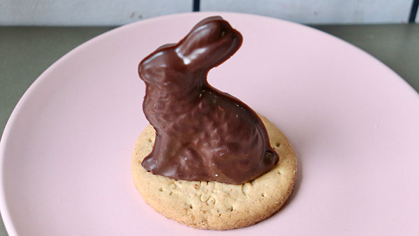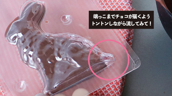 片側のウサギの凹みを満たすくらいに、チョコを流し入れます。