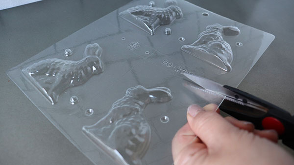 このチョコレート型は1枚に4つの凹みがあって、2つを重ね合わせて使いますので、ハサミでカットして使ってください。