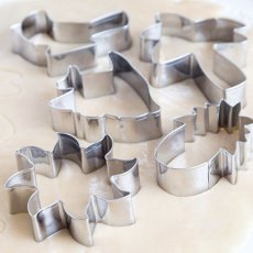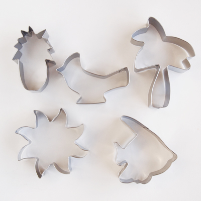 米国 Fox Run社のクッキー型、パイナップル、太陽、ヤシの木、熱帯魚、小鳥の5個セットです。