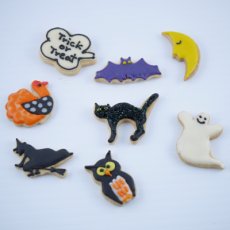 コウモリ、黒ネコ、吹き出し、月、ターキー(七面鳥)、魔女、オバケ、ジフクロウ、かぼちゃの定番9種類が網羅されていて...