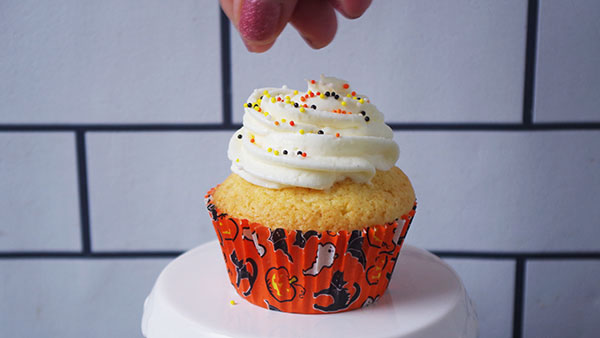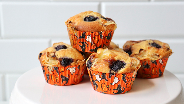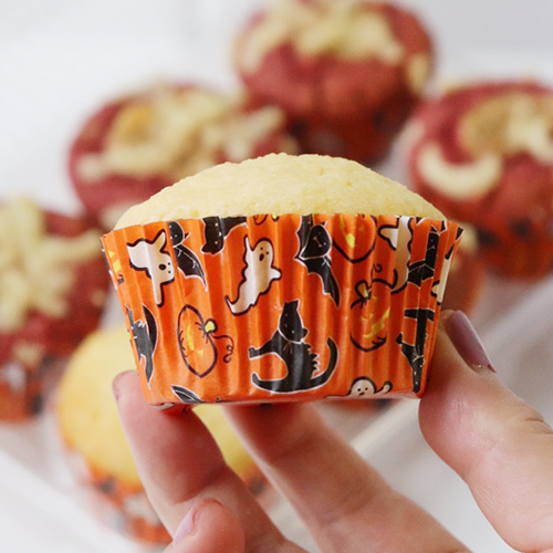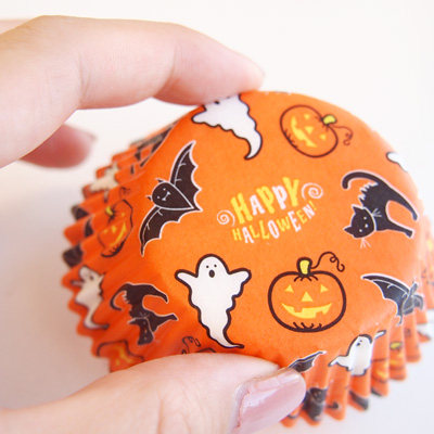 ベースのオレンジはハロウィン特有のカラーですし、オバケ、コウモリ、黒猫、カボチャの柄が描かれていて、シンプルなマフィンを焼いても絵になるデザインです。