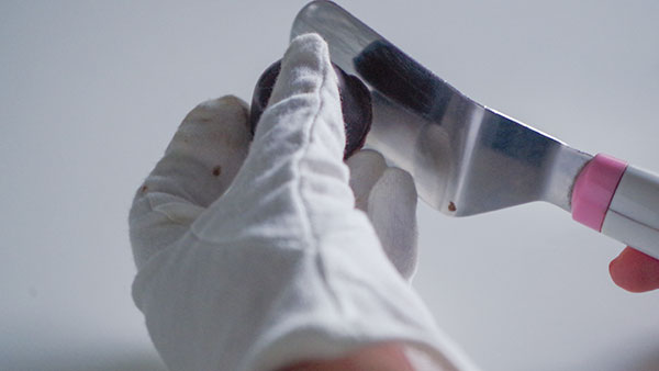 お湯につけて温めたパレットナイフ(水分はしっかりとって!)をガビガビした部分にあてると、スッとチョコが溶けて美しい曲線を作れます。