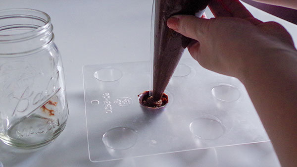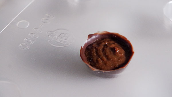 ガナッシュは8〜9割入れたあと、キャンディライター(またはテンパリングしたチョコ)で蓋をしてあげます。外側のチョコが固まったら完成。