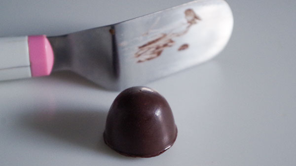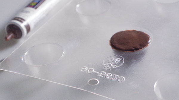 できれば、テンパリングしたチョコでもいいし、キャンディライターを筆で型に塗ったあと、内側にチョコレートと生クリームを混ぜたもの(=ガナッシュ)を詰めてみてください。