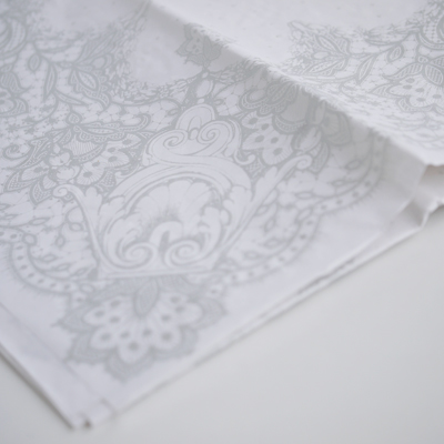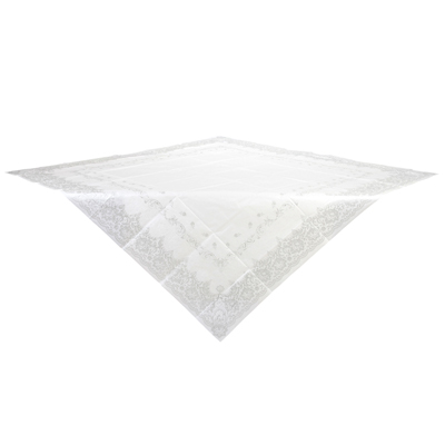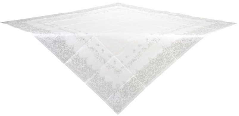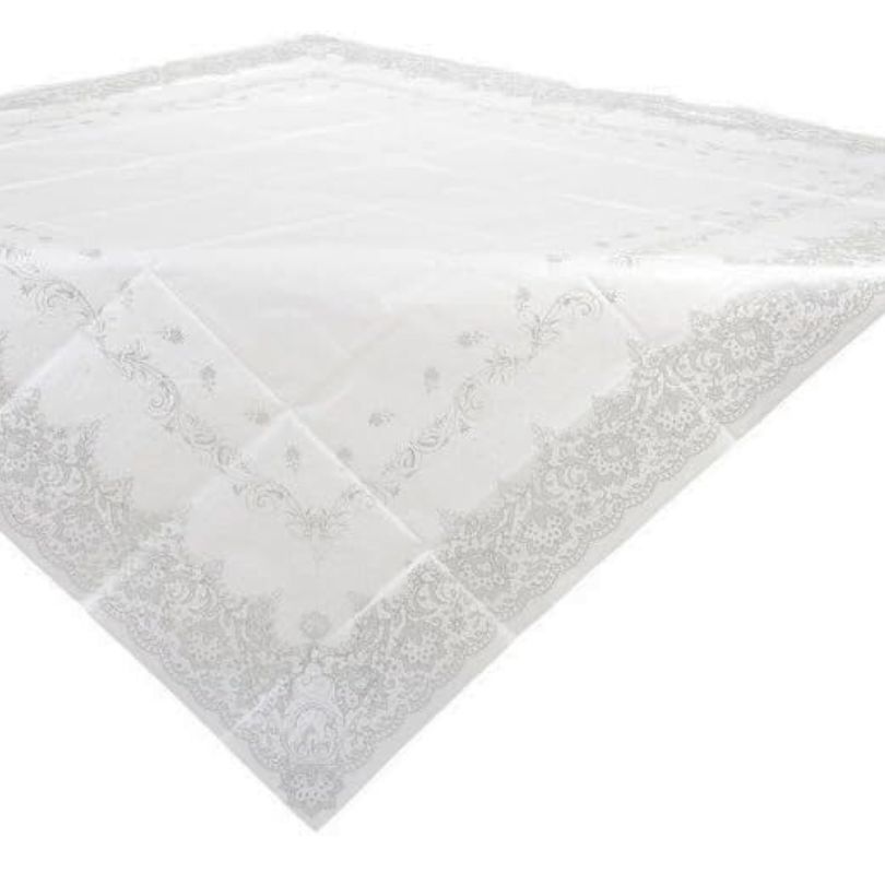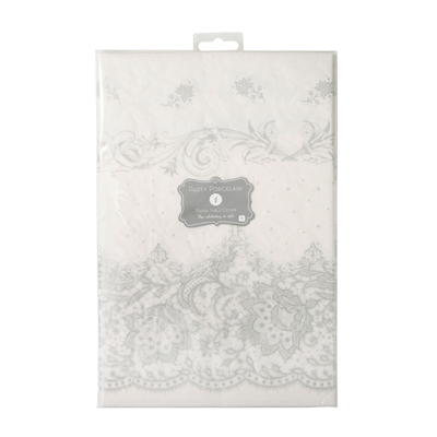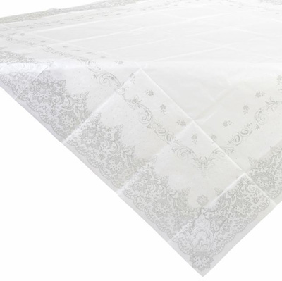 英国Talking Tables(トーキングテーブル)の白地にシルバーのデザインが施されたテーブルクロスです
