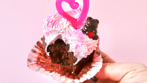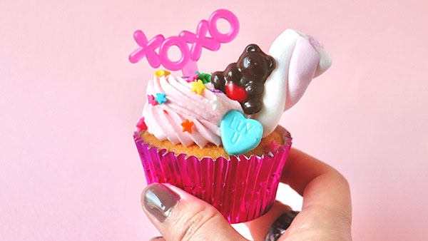 ハートを抱えたテディベアのこのチョコレート型は小さめで、パフェやカップケーキのデコレーションに加えると可愛いプチサイズです... カップケーキにのせてみたんだけど、可愛いでしょ?